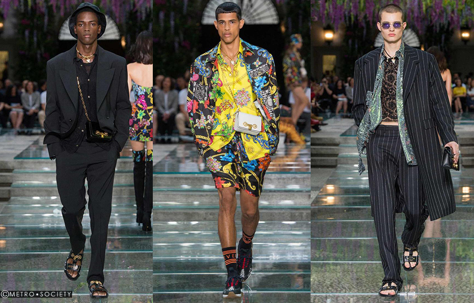 นี้หยิบยืมมาจากสไตล์ของผู้หญิงโดยสวมใส่กับเสื้อผ้าสไตล์ชุดนอนผ้าไหมพิมพ์ลายโค้ตหนังงูเทียมในโทนสีขาวดำรองเท้าแตะสุดคลาสสิคประดับตกแต่งด้วยหัวเมดูซ่าสัญลักษณ์อันเป็นเอกลักษณ์ของแบรนด์หมวกทรงบั๊กเก็ตและรูปทรงใหม่ของสนีกเกอร์รุ่น Chain Reaction คือความโดดเด่นของเครื่องประดับประจำซีซั่นนี้