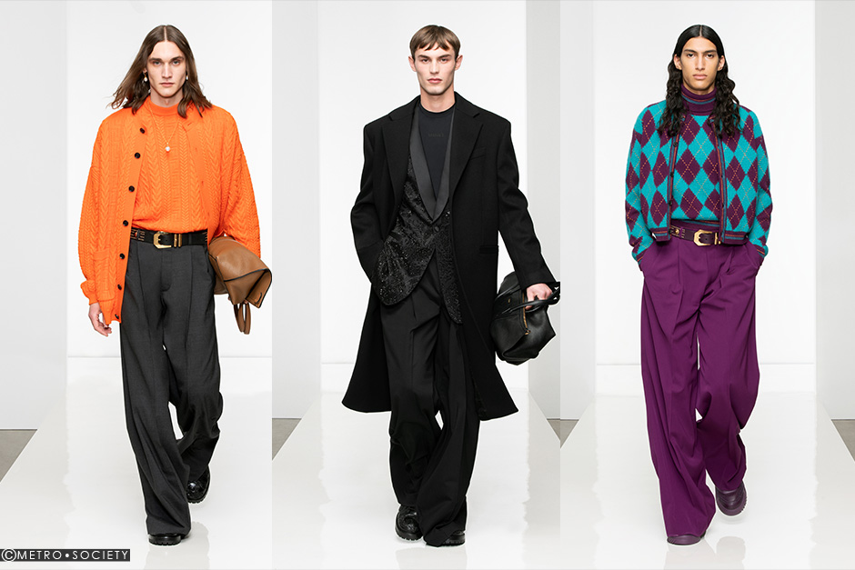 เอกลักษณ์ของแบรนด์มักถูกนำมารังสรรค์ตามรากฐานของแบรนด์ โดยเอกลักษณ์ชุดเสื้อผ้าของแบรนด์เวอร์ซาเช่ (Versace) ปรากฏให้เห็นอีกครั้ง ซึ่งครั้งนี้มาในรูปแบบ นุ่มนวล และไร้โครงสร้าง ทำให้เคลื่อนที่อย่างสะดวกสบายและ มีความพลิ้วไหวอีกด้วย โดยเสื้อผ้าผู้ชายถูกเติมแต่งด้วยลายทาง และลายหมากรุก สีพาสเทล หรือ สีน้ำ ซึ่งปรากฎบนแจ็คเก็ตไร้ซับใน และชุดสูทขนาดใหญ่ ราวกับถูกประดับตกแต่งด้วยจิตรกร ส่วนเสื้อไหมพรมผ้าวูลแจ็คการ์ด และเสื้อโค้ท ถูกรังสรรค์ใหม่ด้วยผ้าวูลขัดมัน ผ้าแคชเมียร์ และผ้าไหม ที่มีความนุ่มนวลและสามารถแทรกตัวตามสัมผัสมืออย่างสนุกสนาน