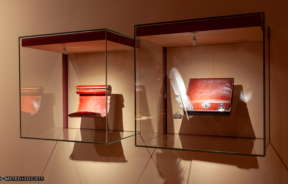 ชุดเครื่องเขียนสำหรับเดินทาง ศตวรรษที่ 18, หนังโมร๊อกโก โลหะเงิน และ ผ้าไหม / ชุดเครื่องเขียนสำหรับเดินทางศตวรรษที่ 19 หนังจากโมร๊อกโก กล่องใส่ทรายทำจากทองเหลืองและเงินฝังมุก จากคอลเลคชั่นของ Emile Hermes