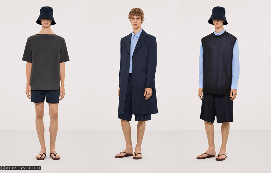 Accessories are understated to offer balance to the technicality of the garments. Key to the collection for both men and women is the straight-cut bucket hat reworked in high shine and moiré fabrics. For womenswear, this has evolved into a wide-brim sunhat that offers a clean silhouette and shelter from the elements. A slip-on shoe can be worn as both a slipper or a mule to offer versatility and creativity to the wearer while fluid natural forms are present in the collection’s sterling silver jewellery. The menswear parachute ripstop bag is designed for functionality while stacked and rounded leather sandals with a knot feature complete the season’s pared-back look.