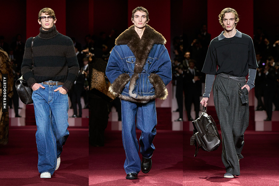 Simplicity takes the lead. Oversized silhouettes with pleated trousers, reworked leather and denim, and T-shirts intentionally creased to feel alive—all embody the effortless allure that Dolce&Gabbana elevates through careful design. Chunky hand-knit sweaters, heavy flannel, wool, and tweed complete the picture of relaxed yet refined daytime elegance.