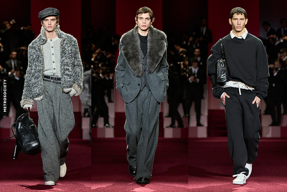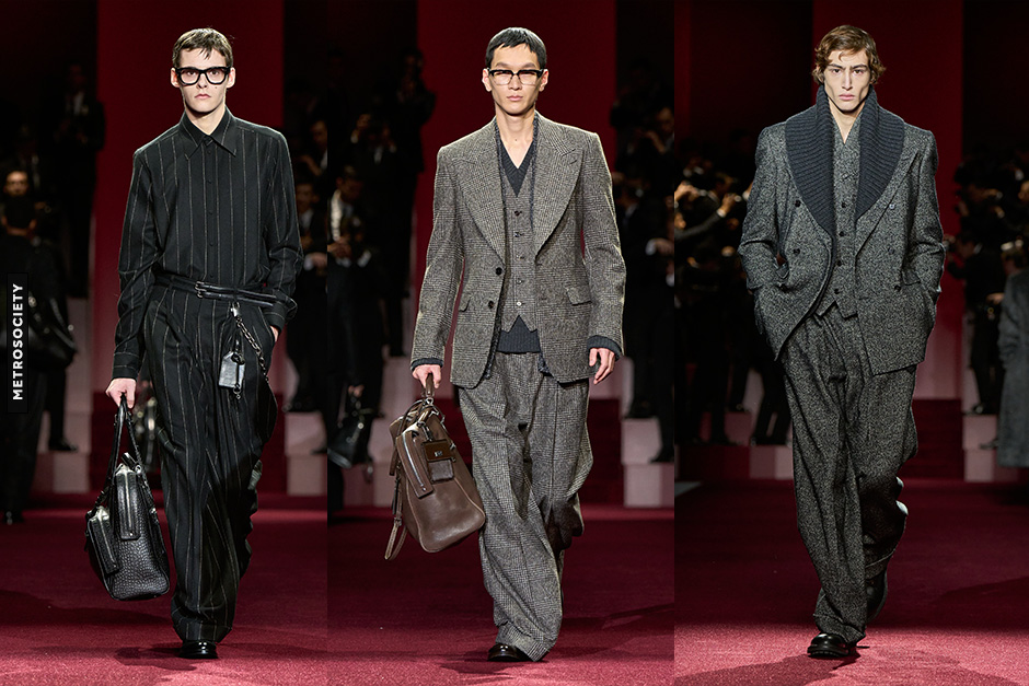 Blazers with extra-wide lapels, stand collars, and built-in scarves showcased the house’s flair for creativity. Suits remained at the heart of the wardrobe, proving their timelessness when paired with satin shirts and classic trousers. Dolce&Gabbana’s tailoring reminded us that sophistication lies in both detail and restraint.