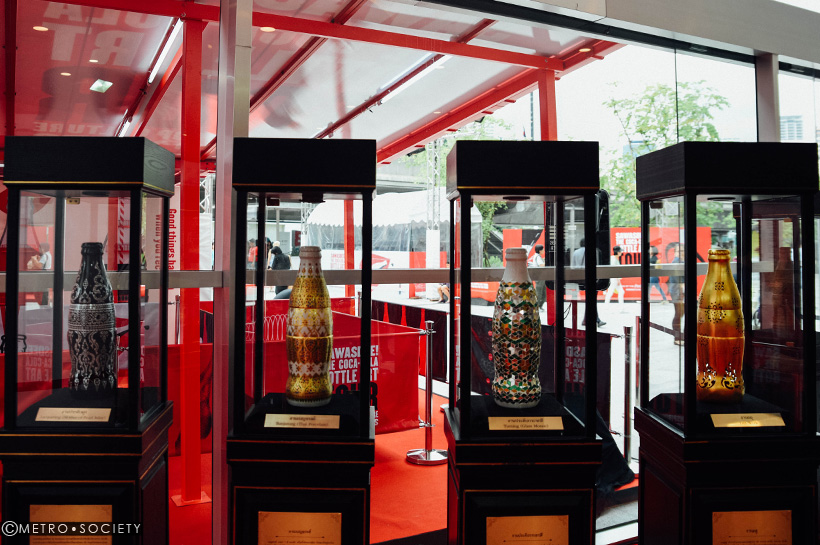 แต่ก่อนจะพาเข้าไปเดินดูงานข้างใน ด้านหน้างานมีขวดที่เป็นเอกลักษณ์พิเศษสำหรับประเทศไทย อย่างเช่น ขวดที่เป็นงานเบญจรงค์ งานประดับกระจกสี งานฉลุ งานจิตกรรม งานติดลายรักปิดทองเขียนสี งานเครื่องเงินลงยาราชาวดี และ งานไม้แกะสลัก รูปทรงขวดโค้กที่ผสมผสานกับศิลปะของไทยอันเป็นเอกลักษณ์ได้อย่างลงตัว เชื่อว่างานแกะสลักเหล่านี้ไม่มีในประเทศอื่นแน่นอน