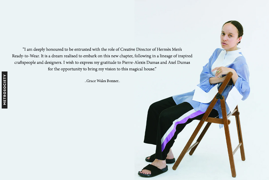 Grace Wales Bonner กล่าวว่า ”เธอรู้สึกเป็นเกียรติอย่างยิ่งที่ได้รับความไว้วางใจให้บทบาท Creative Director ของ Hermès สาย Menswear มันคือความฝันที่เป็นจริงที่จะเริ่มบทใหม่ในสายงานนี้กับบ้านที่เต็มไปด้วยช่างฝีมือและนักออกแบบที่สร้างแรงบันดาลใจ”